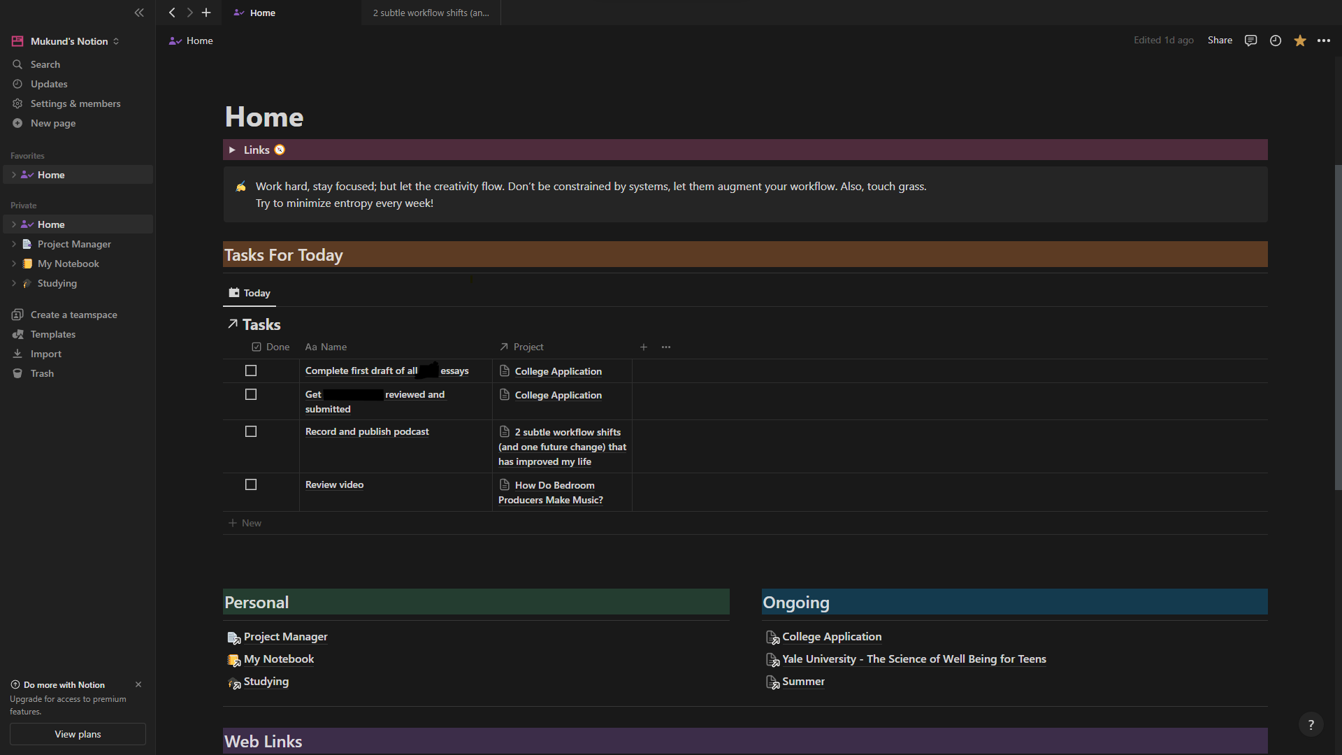 These pages are differentiated by the kind of information they hold: the “Project Manager” contains information about the projects I’m working on and the tasks associated with these projects, “My Notebook” consists of everything I’ve noted down (no matter what it’s about), and “Studying” has all my revision material.